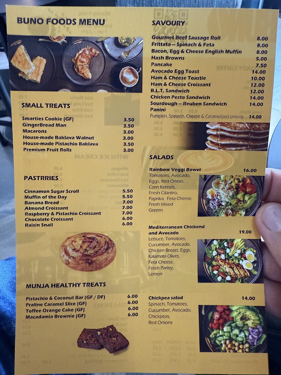 The menu at Buno features a selection of deliciously crafted items that cater to various tastes. Indulge in a fresh Rainbow Veggie Bowl for A$16—a vibrant medley of fresh vegetables that dances on the palate. If you're in the mood for something heartier, try the Mediterranean Chicken and Avocado for A$19, where tender chicken meets rich avocado in a perfect harmony of flavors.